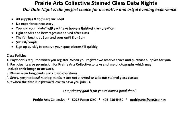 | Call Patrick at (405) 436-5439 to reserve you spot in our classes Must be 18 years or older in order to enroll in our Prairie Arts Collective classes. We also are available for company parties, team building and family stained glass nights. |