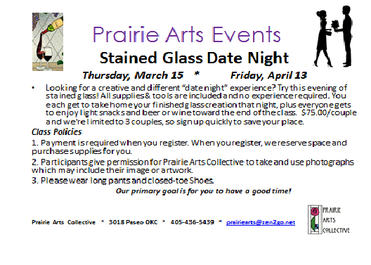 | Date Night Stained Glass Class May 11 or 17 6-9 pm 75.00 per couple Five Week Beginner Stained Glass Class Begins June 6 Wednesday 6-9 pm To sign up Call 405-436-5439 or email: prairiearts@zen2go.net |