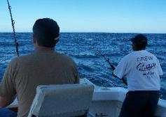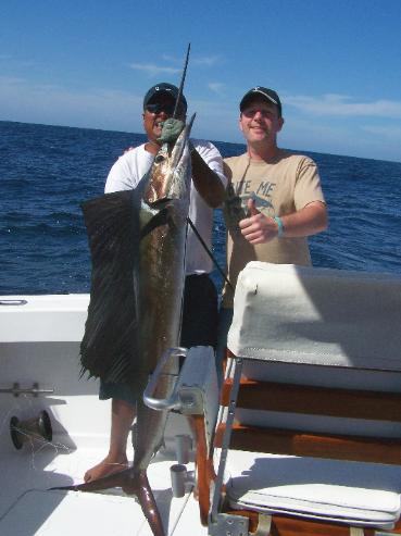 | Trevor and son, Alejandro, celebrate the catch of the treasured Sailfish. The cast and crew named the fish Wanda and the boys quickly released her back to the Pacific blue waters. |