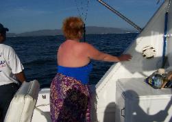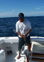 | T-Man springs into action with Alejandro as the rest of us look on drinking beer and snapping photos. Within ten minutes Wanda was hauled aboard by Trevor's son and just as quickly released after the photo op. |